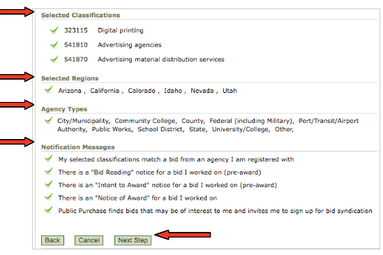 Step 5: Notifications - Here you will be asked to choose which types of agencies you are interested in working with. These could be Cities, School Districts, Public Works or Colleges and Universities. You will also need to choose when you will be notified of bids. This can be at any stage of the bid process. You can click [Select All] in order to keep up with every stage of the bid.